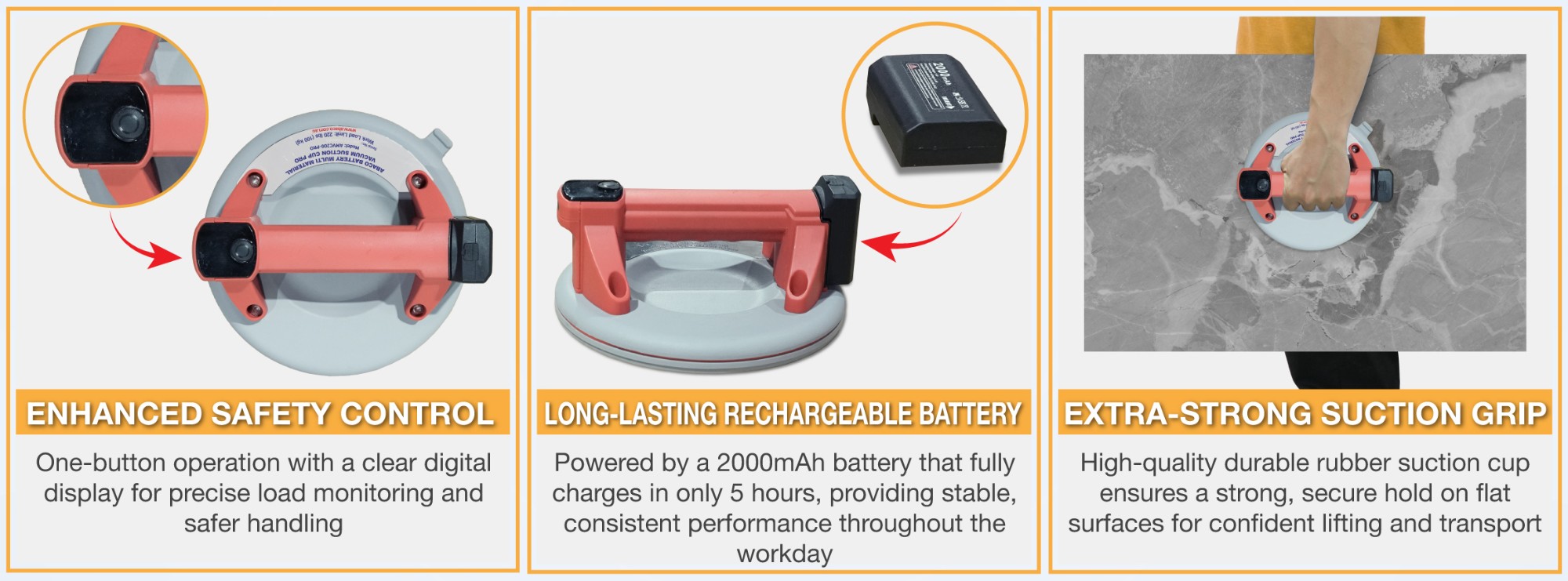 Abaco Battery Multi Material Vacuum Suction Cup Pro is built for handling stone, glass, and other flat materials with ease. With a clean digital display and practical upgrades, this model helps you work more efficiently and safely.
