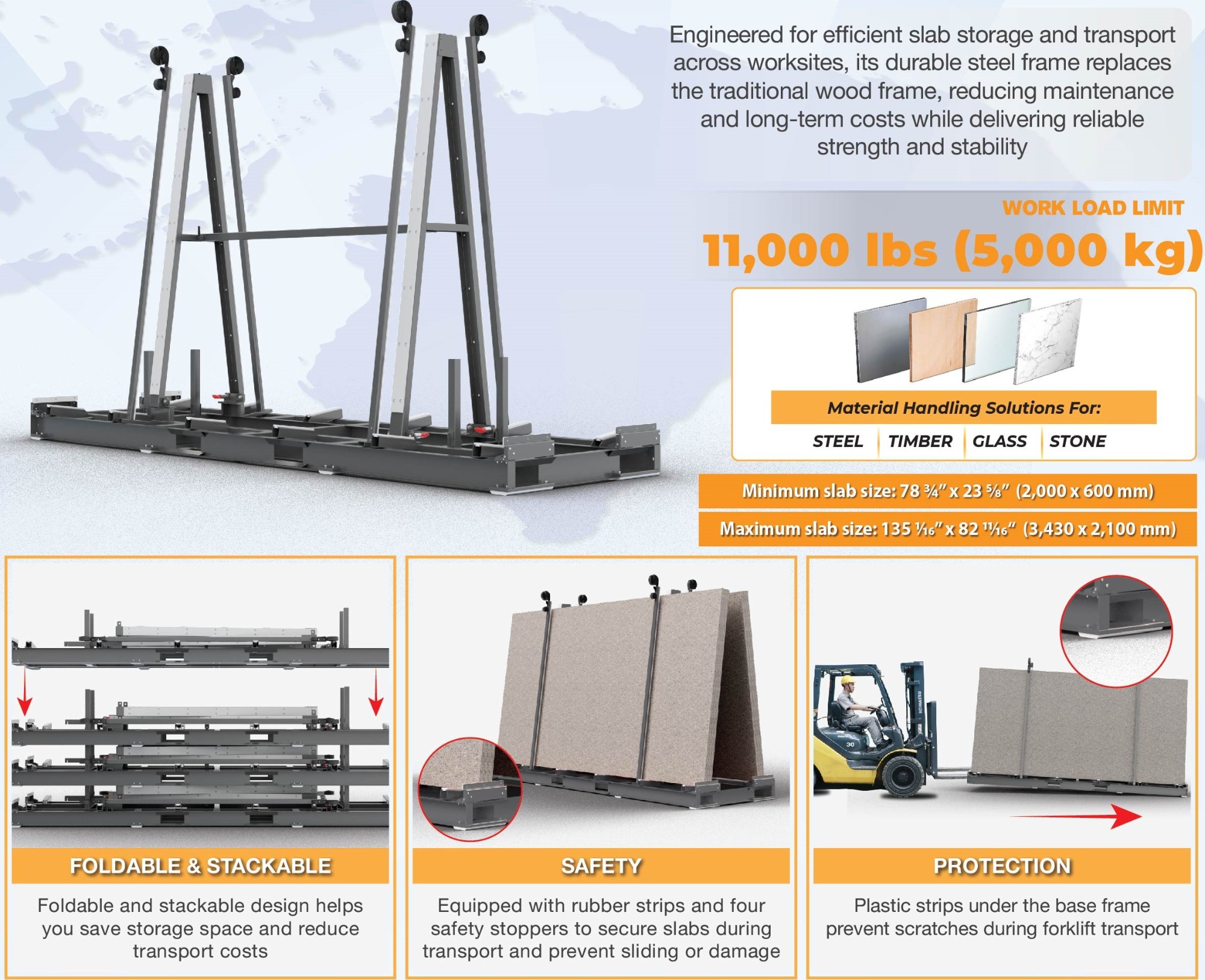 ● Capable of safely managing heavy loads up to 11,000 lbs (5000 kg) ensures effortless handling of slabs.