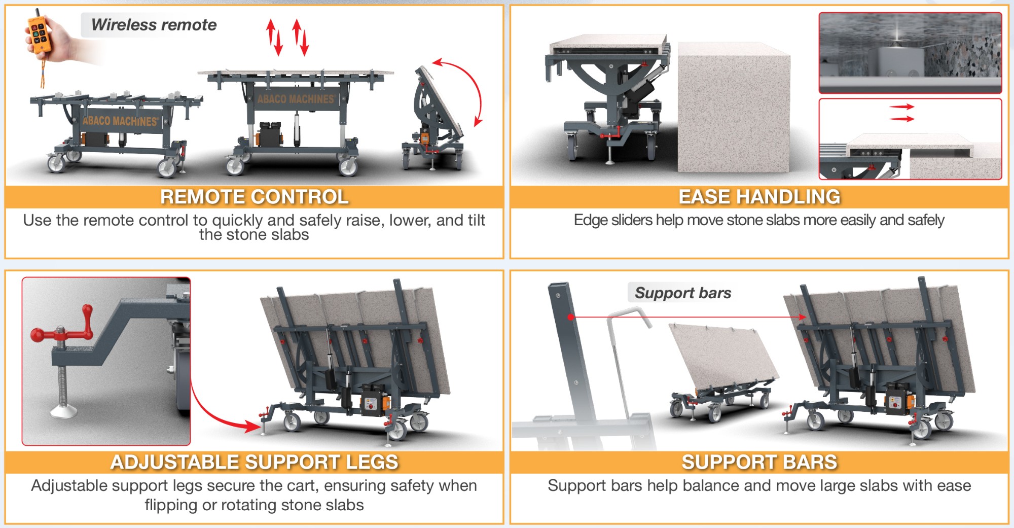 Modern and high-protection designs allow this Kitchen Installation Cart can work with stone slabs up to 1100 lbs (500 kg).