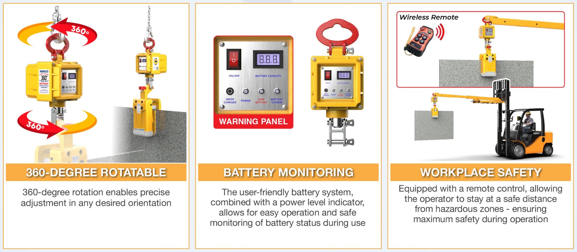 Abaco Rotary Motor Shackle ARMS1200 is a device that facilitates the easy lifting and transportation of stone slabs. It is compatible with stone clamps, glass clamps, forklifts and hoists. Notably, the device allows for the rotation and movement of materials in both directions, providing flexible and highly efficient operation.