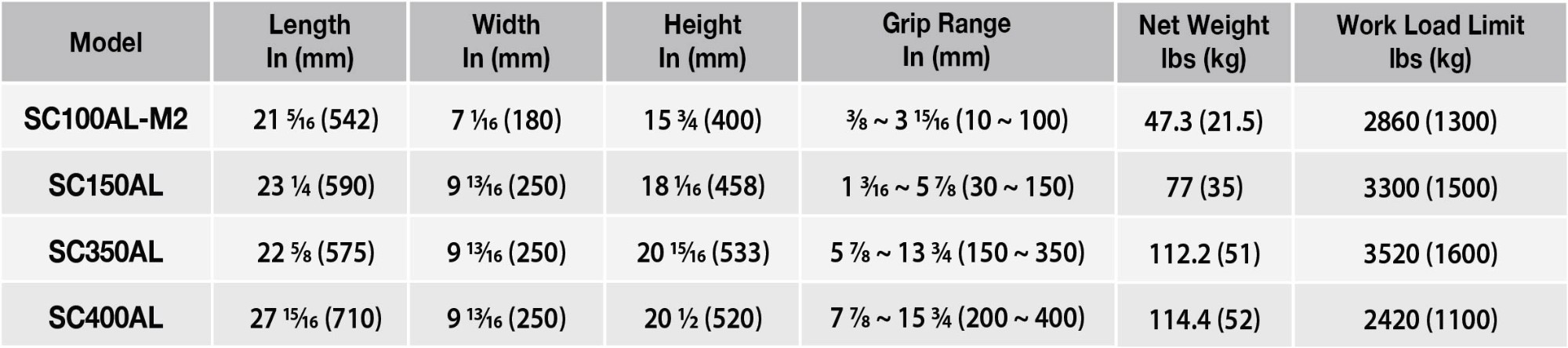 To meet diverse materialthickness requirements, our Scissor Clamp is available in four model options: SC150AL, SC350AL, SC400AL and SC100AL-M2 — allowing users to select the most suitable clamp for their application.