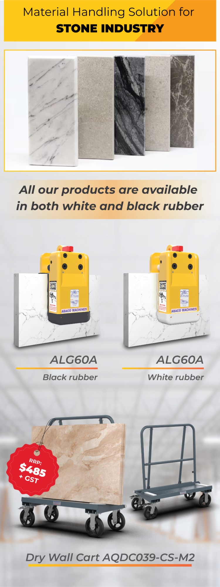 A special device for maneuvering stone slabs within warehouses, or factories.