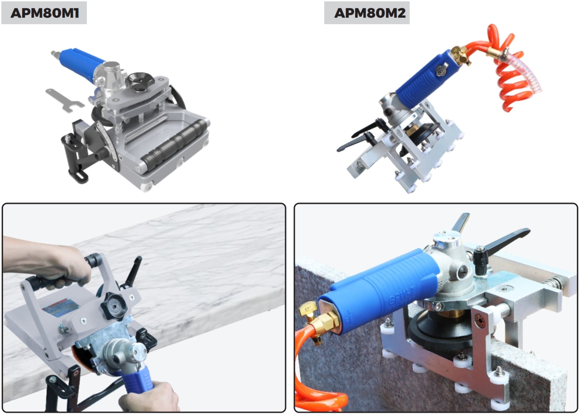 Abaco Air Polishing Machine is a solution for polishing the surface of slab edges using compressed air. Non-electric Air Polishing Machine ensures maximum safe working conditions for users. It consists of The main body, Motor mounting pad, and Pneumatic polisher.