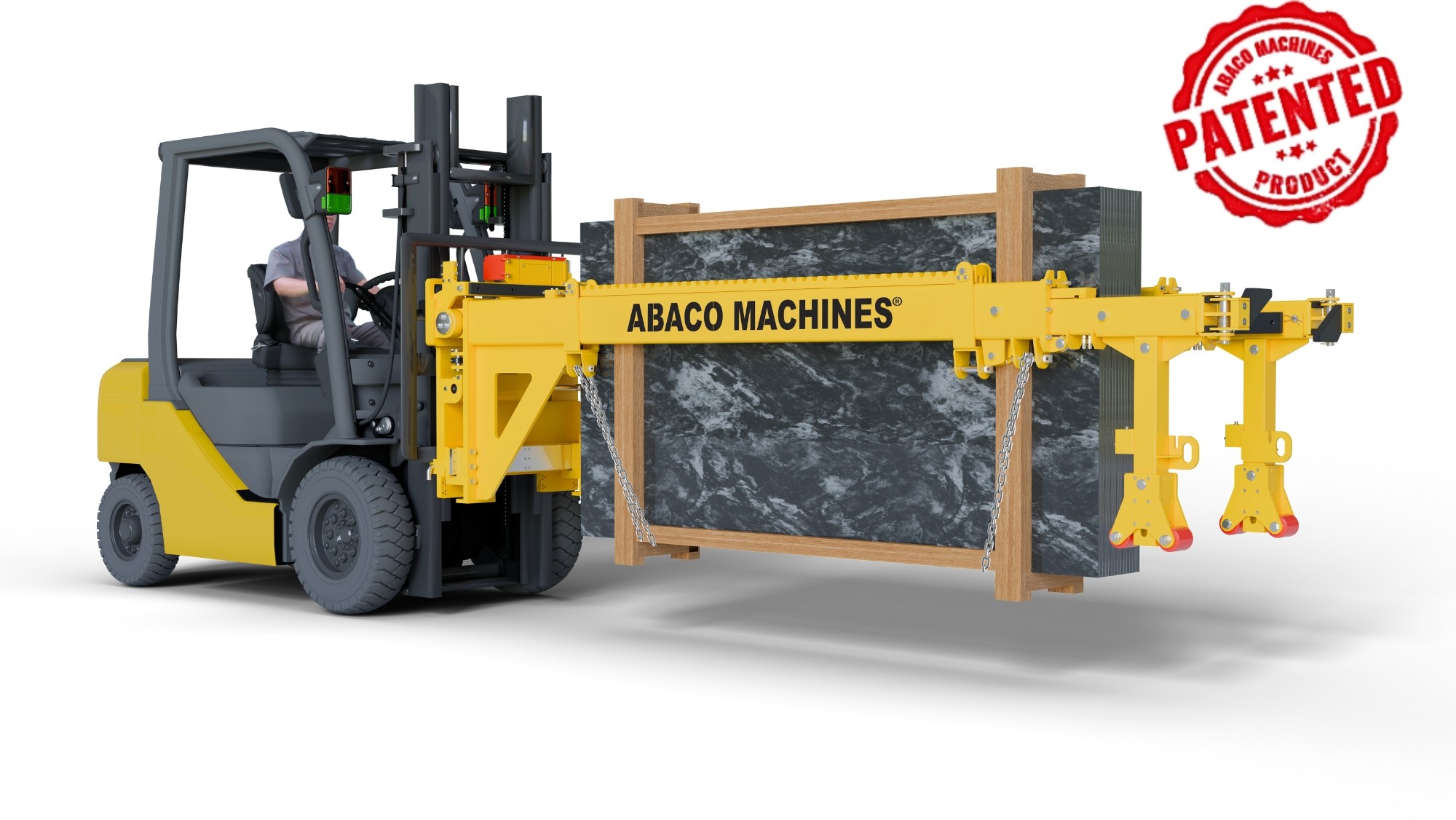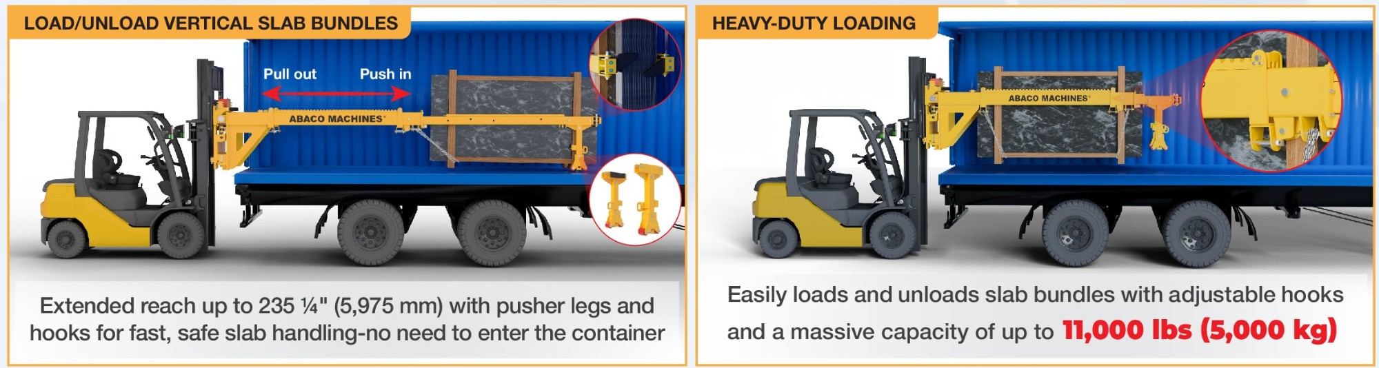 Abaco Container Bundle Slab Load - Unloader Pro is combined with a forklift truck to easily lift, move and unload packages from the container truck with a load capacity of up to 11000 lbs (5000 kg)