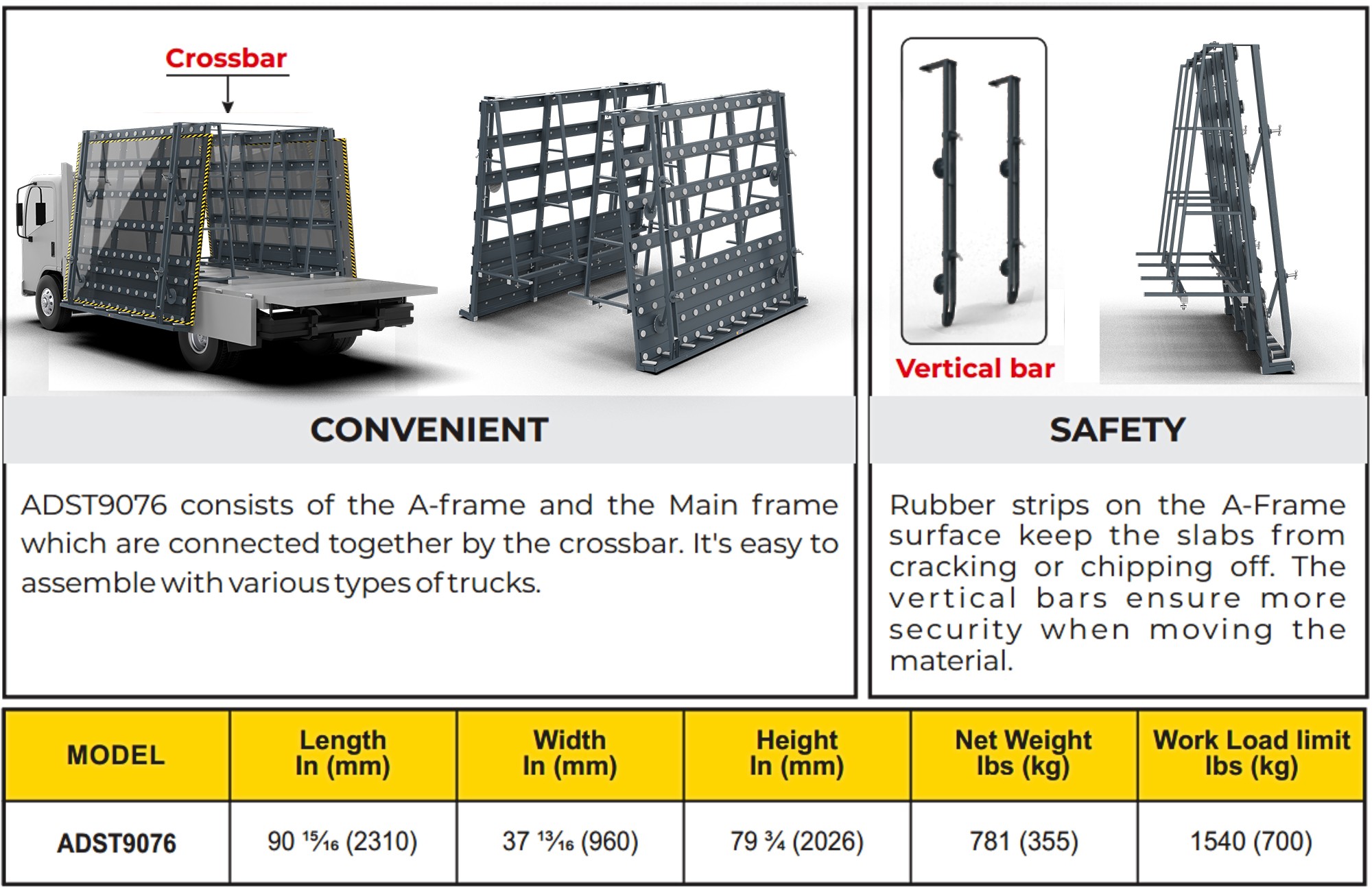 - Dropside Truck A-frame (ADST9076) is designed to combine with the truck in maneuvering the glass slabs.