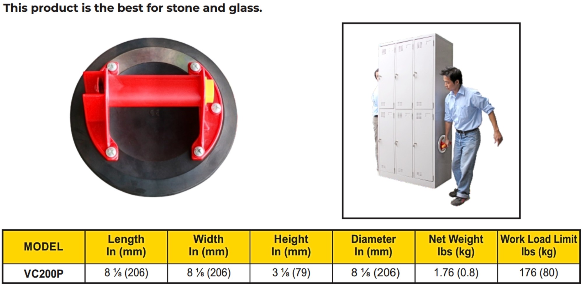The Hand Held Suction Cup (VC200P) is excellent for lifting and moving flat and nonporous surfaces such as glass, tile, aquarium, plastics, engine valves, furniture, metal, stone slabs, and appliances.