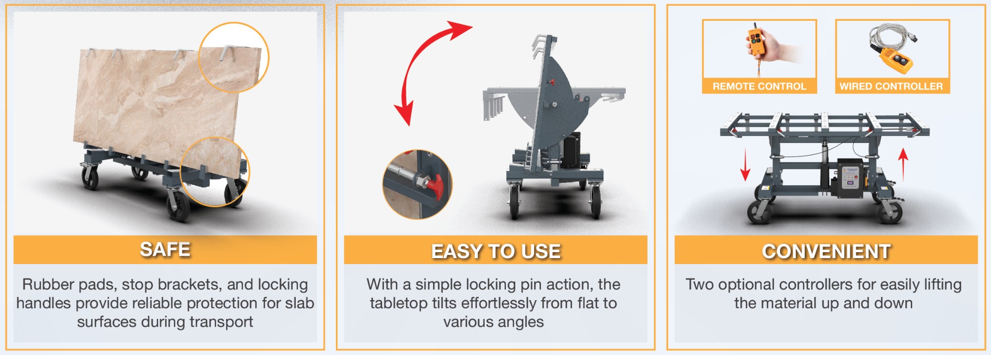 Abaco Power Kitchen Processing Table is used to store, move, lift, and lower the stone slab in the kitchen during the installation process. Its flexible operation increases security for both users and the slab during working.