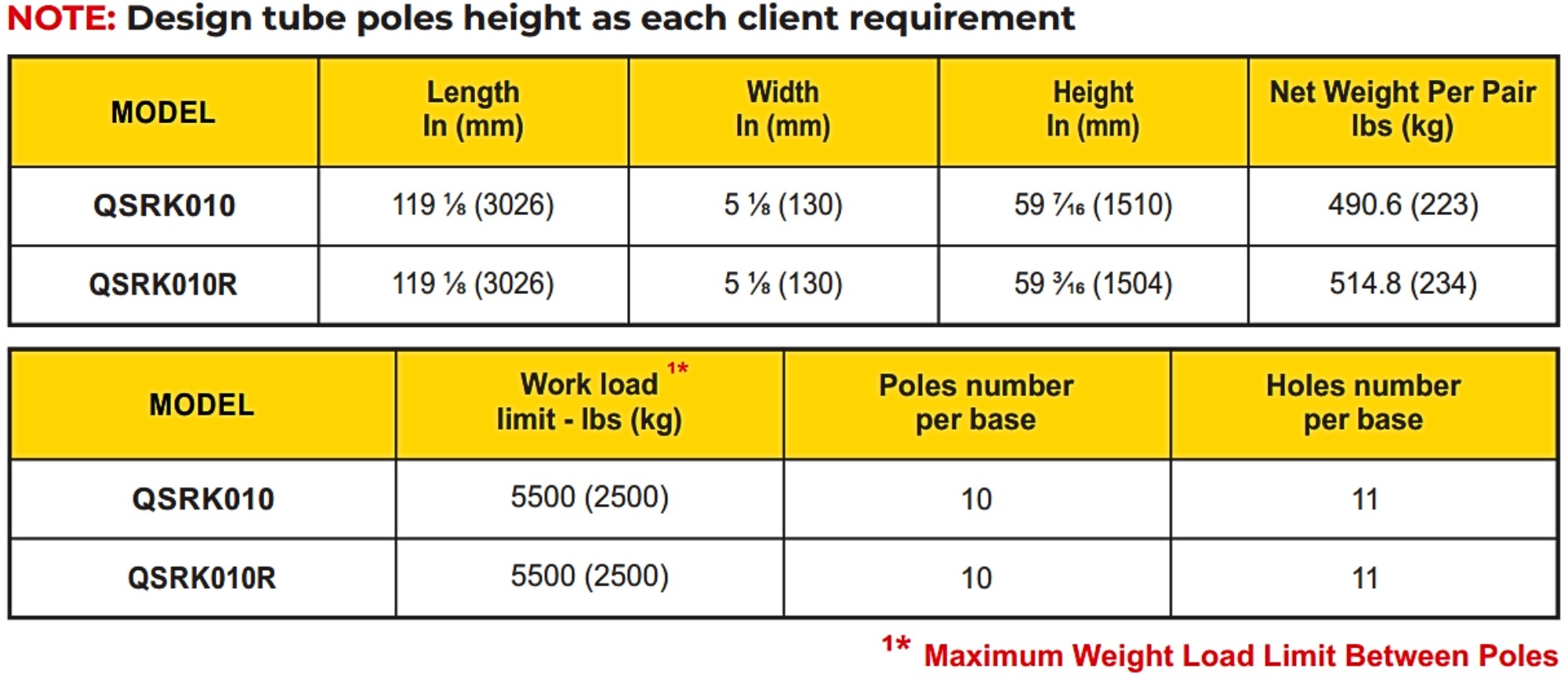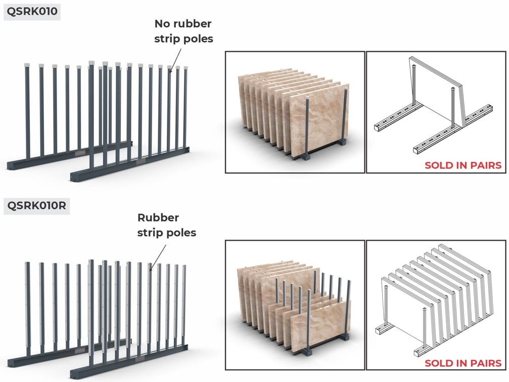 QSRK010, and QSRK010R are further versions in the Slab Storage Racks series. This collection addresses consumer concerns and offers solutions for dealing with material slabs.