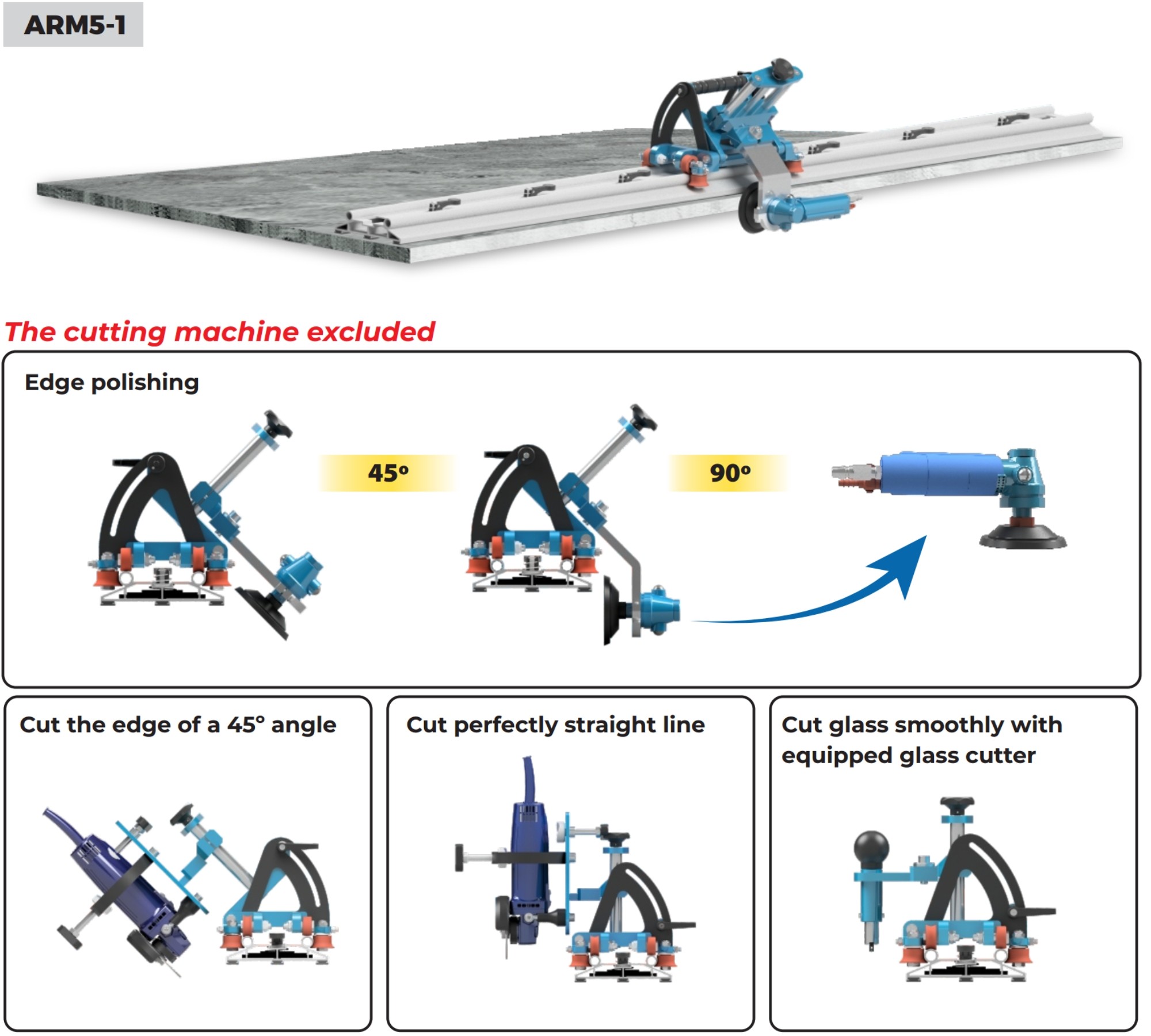 Abaco Rail Machine 5 in 1 is produced to cut and polish artificial and natural stones with clean, correct edges. This Cutting Machine can also use to handle glass sheets for multiple purposes.
