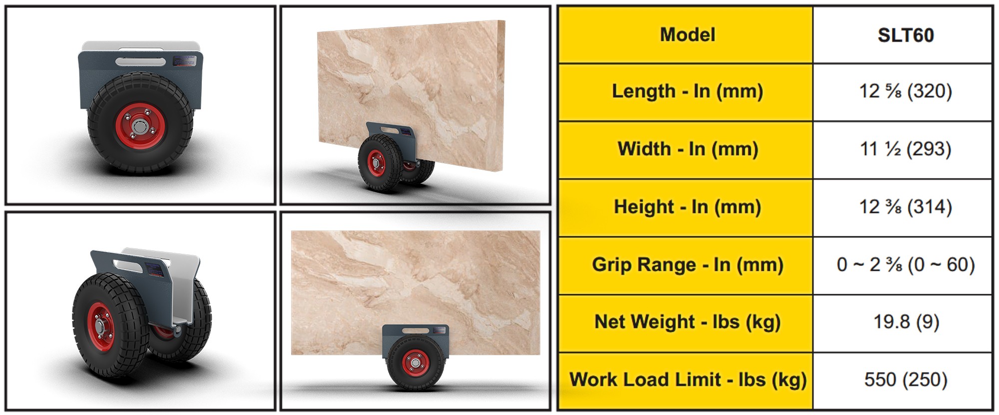 Abaco Self-Locking Dolly is designed for moving stone slabs at work sites. It is made with pneumatic tires to make transporting the slab easier on different moving surfaces.