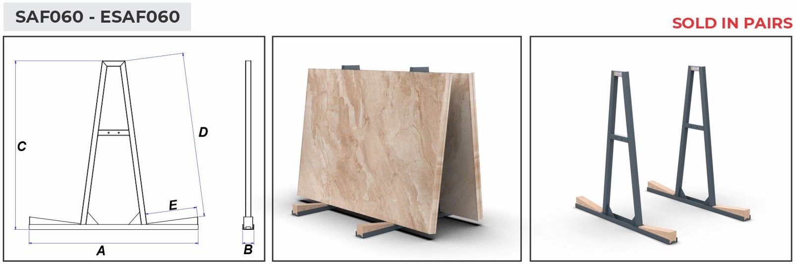 Abaco Standard A-Frame is an indispensable tool for storing stone slabs in warehouses or other work sites. It is a great support tool to make your work sites neat and ensure the safety of your materials. The compact design saves your space and makes it easy to transport.