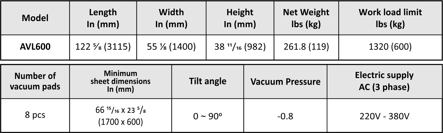 Technical specifications of Vacuum Lifter